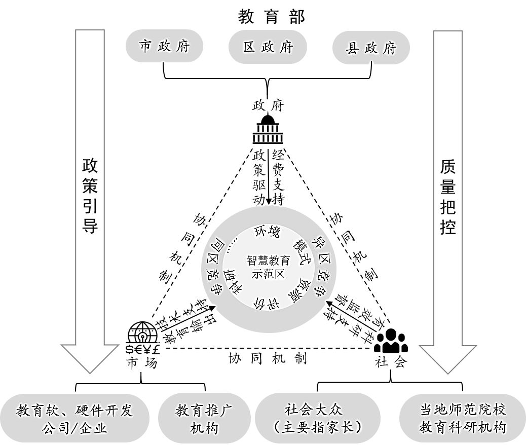 政府、市场、社会三个支点形成多元协同体,共同助力智慧教育示范区的创建:①政府主要指各市、区、县教育局,在政策驱动和资金支持方面发挥作用。在政策驱动方面,政府主要依据教育部的政策文件,研制适合本区域的智慧教育示范区创建规划、配套策略及测评机制。研制规划时,进行充分的基线调研是准确划分引领校和被托校、把握不同教育阶段建设重点的重要前提。在资金支持方面,政府分批、分次、有序地为不同学校提供“等比量”的创建启动资金,后续资金的提供则根据与引领校和被托校签订完成的绩效协议预期目标(阶段目标、效益等)进行弹性拨款。②市场在技术支持和教育推广方面全力配合。一方面,教育软、硬件公司/企业通过投标、竞标等方式,与政府建立商业合作伙伴关系,为学校提供硬、软件技术支持。另一方面,需要形成以教育推广机构为主的教育推广链,主要负责创建成果的区域、周边及国内宣传、推广。③社会在有效监督和科研支持方面积极参与。社会大众(主要指家长)通过相关的平台(如当地教育官网)实时了解智慧教育示范区的相关创建政策、过程、成果等信息。当地师范类院校、教育科研机构则协助政府做好顶层规划,帮助企业制定竞标方案,指导学校具体实施方案等。