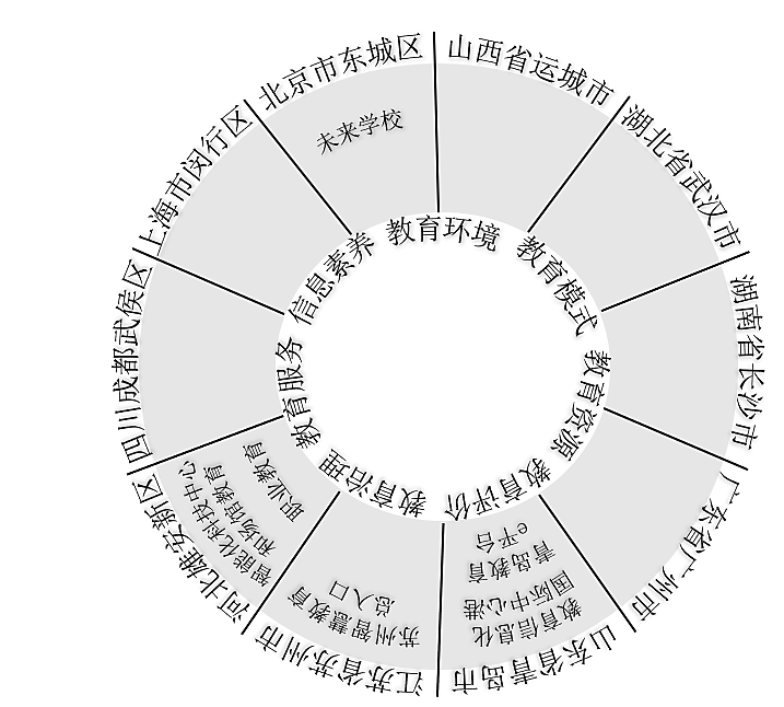 各示范区的创建发展与当地政治、经济、文化息息相关,各有特色,其创建任务的侧重点如图2所示。图2显示,10个示范区的重点创建任务不同程度地集中在教育环境、教育模式、教育资源、教育评价、教育治理、教育服务、信息素养七个方面。其中,北京市东城区、广东省广州市的重点创建任务对教育治理的关注不足,但北京市东城区对“未来学校”的探索非常关注;湖北省武汉市、湖南省长沙市的重点创建任务对教育服务的关注不足;四川省成都市武侯区的重点创建任务除了“师生信息素养”,其它均有提及;山西省运城市重点关注教育资源的建设。此外,“智慧教育示范区”作为有力支撑雄安国际化城区建设的内核之一,为着眼于教育发展的高端形态[4],还增加了“职业教育”、“智能化科技中心和场馆教育”等国家特色创建任务;江苏省苏州市、山东省青岛市作为两个创建培育区,除了重点建设内环(教育环境、教育模式等)部分任务外,还增添了区域特色创建任务;苏州打造“苏州智慧教育总入口”;青岛则升级优化“青岛教育e平台”,建造“教育信息化国际中心港”。
