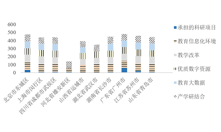 本研究从承担的科研项目、教育信息化环境、教学改革、优质数字资源、教育大数据、产学研结合六个维度,比较分析了10个示范区的基础创建条件,如图1所示。其中,河北省雄安新区在教学改革、优质数字资源、教育大数据三个维度缺少数据。