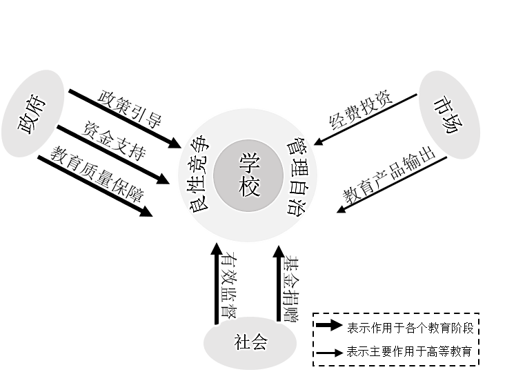 新加坡教育部代表政府执行教育管理权,在政策上宏观引导教育体制改革、教材编写、学生发展计划等,其对基础教育的政策指导比高等教育更精细。在资金支持方面,政府是基础教育和高等教育主要的资金提供方。不同的是,基础教育的办学经费几乎全部来源于政府,而高等教育的办学费用只有一部分来源于政府,另一部分则来自市场投资和社会捐赠。政府通过建立科学的测量和评价机制,对教育质量进行宏观把控。学校卓越模式(School Excellence Model,SEM)、学校排名系统等是基础教育质量得以保障的手段,而高等教育主要运用绩效机制和大学评估框架(Quality Assurance Framework for Universities,QAFC)来监测高等教育质量[7][8]。