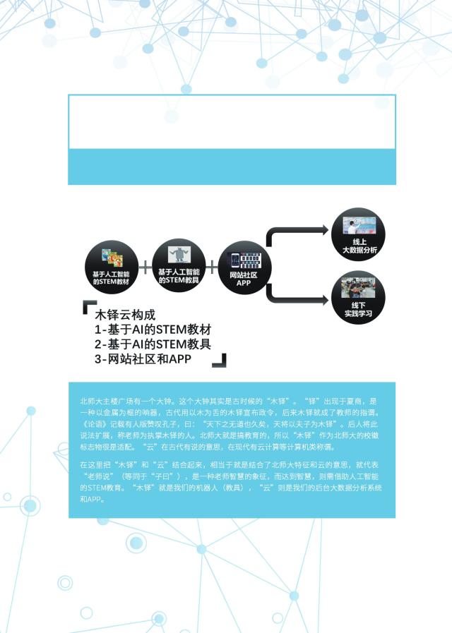 木铎云,是一个基于人工智能和云端大数据分析的STEM教育平台,主要包括一套基于AI的STEM教材、基于AI的STEM教具、云端大数据分析的网站和木铎云APP。产品以人工智能为主线,对STEM教育知识进行系统化串联,适用于国内K12教育和高等教育学生。木铎云采用课堂上学习与课堂下实践、线上学习与线下测试、大数据分析系统分阶段出具学生学习质量报告,网站和APP云端同步学习等方式,让STEM的学习有章可循。我们的目标是借助北京师范大学和互联网国家工程实验室的在国内教育界的优势力量创建一家具备“统治力”的基于人工智能的STEM教育平台,满足当前国内千亿级STEM市场需求。