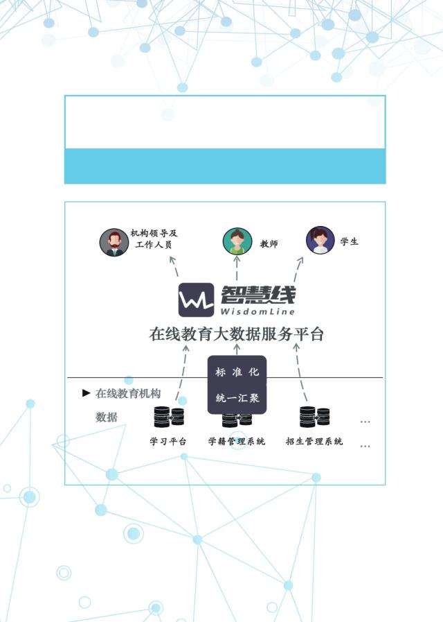 智慧线大数据分析平台主要服务对象为开放大学等各类从事在线教育并拥有在线学习平台的机构,同时也在基础教育领域做进一步的拓展。 平台通过建立大数据管理与分析系统,帮助机构形成规范的大数据采集、 汇聚、管理、分析和应用体系,并根据机构应用需求研制并完善各类大数据模型,诸如SERI综合评价参考模型和LIPS智能学习预测模型,以实现对各类教学要素的分析、评价、监测、诊断、预测、推荐机制,洞悉隐藏在数据背后的发展之线。平台最终通过App、网站、报告等多种终端的服务形式,分别为决策者、 各级管理者、教师、学习者提供有针对性的大数据服务,进而实现数据驱动下的教学、管理工作持续优化,最终达到精准管理、科学决策的目标。